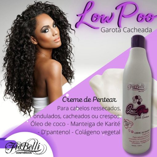 A linha Low Poo Fiobelli é um tratamento intensivo para cabelos cacheados, liberado para as técnicas No/Low Poo, com fórmula livre de sulfatos, corantes, petrolatos, parabenos e silicones.