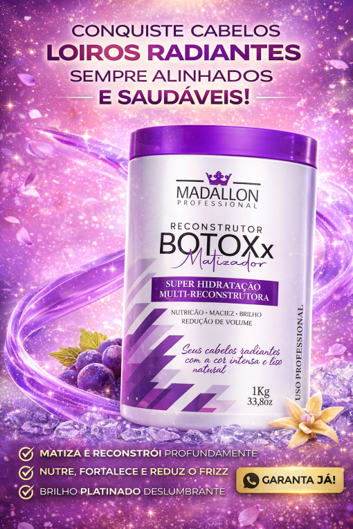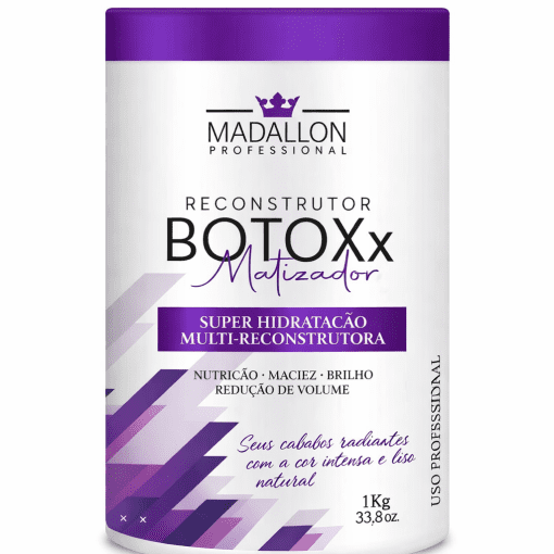 O Botox Capilar Matizador Reconstrutor Madallon (C/A) é um tratamento profissional multifuncional, desenvolvido para reconstruir profundamente a fibra capilar enquanto neutraliza tons indesejados, promovendo fios mais alinhados, resistentes, hidratados e com cor uniforme.