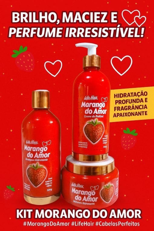 💖 Transforme seus cabelos em uma explosão de brilho, maciez e perfume irresistível! O Kit Morango do Amor Life Hair é o cuidado que seu cabelo merece, com hidratação profunda e fragrância apaixonante. 🍓✨