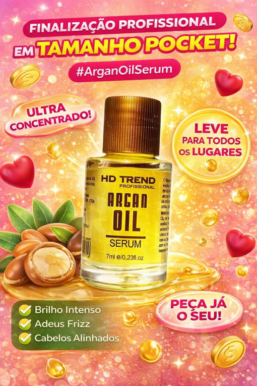 O Sérum Finalizador Argan Oil Trend 7 ml é um tratamento ultraconcentrado desenvolvido para proporcionar brilho imediato, controle do frizz e acabamento profissional aos fios. Enriquecido com Óleo de Argan, ativo nobre rico em vitamina E e ácidos graxos essenciais, atua diretamente na fibra capilar promovendo nutrição, maciez e proteção, sem pesar.