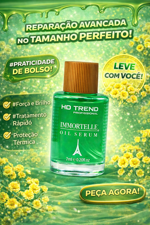 O Sérum Finalizador Immortelle HD Trend 7 ml é um tratamento concentrado e de alta performance, desenvolvido para promover reparação da fibra capilar, brilho intenso e proteção diária, com acabamento leve e sofisticado. Enriquecido com Immortelle (Flor da Imortalidade), ativo reconhecido por sua poderosa ação antioxidante e regeneradora, o sérum auxilia na prevenção do envelhecimento dos fios, mantendo-os mais fortes, macios e alinhados.